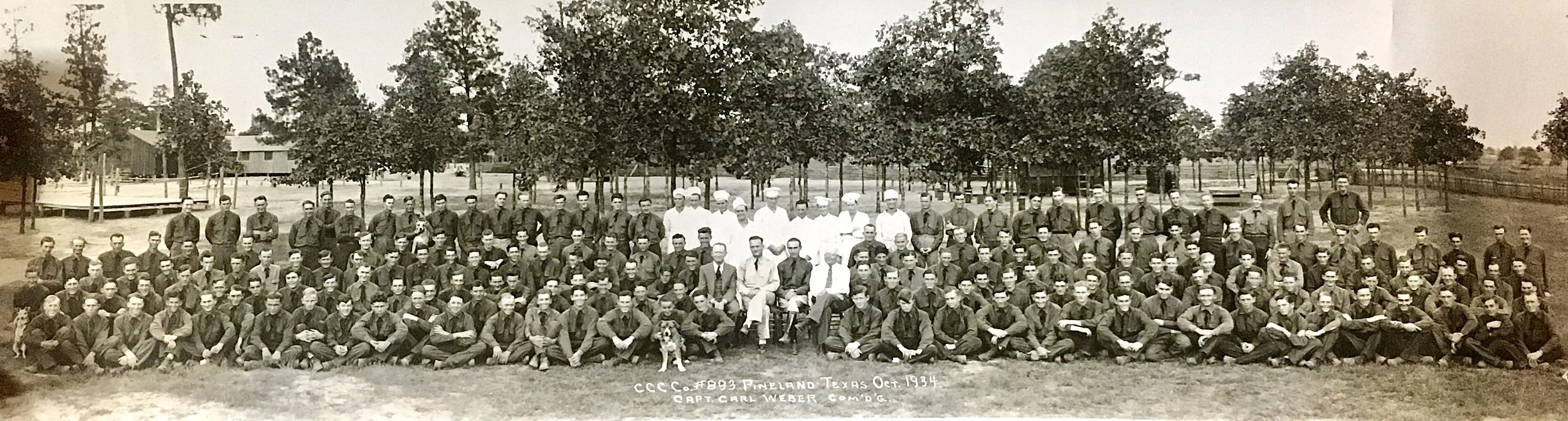 A Cirkut panoramic photograph from my own family’s archive. Civilian Conservation Corps. Co. #893 in Pineland, Texas, October 1934. My grandfather, Eldridge D. West, is seventh from the left in the back row. The photo was taken by E.L. Rothwell, who worked for Euguene Goldbeck’s National Photo & News Service.