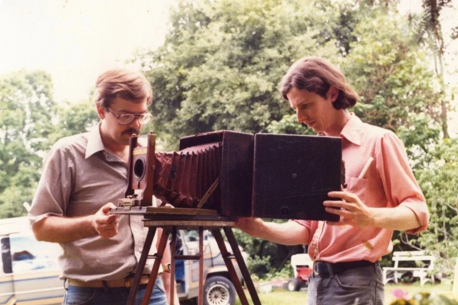 Mark Crabtree and Doug Chadwick inspect Red Ribble's No. 8 Cirkut Camera in Pax, West Virginia around 1979.