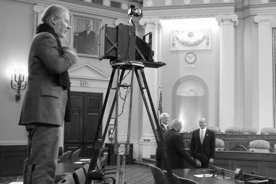 Doug Chadwick with his Cirkut Camera in the chamber of the U.S. House Ways and Means Committee, around 2010.