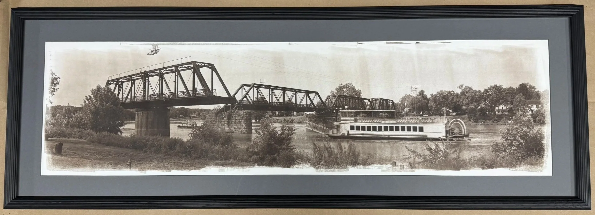 Framed Vandyke Brown print of Harmar Bridge & Valley Gem Sternwheeler, Marietta, 2025