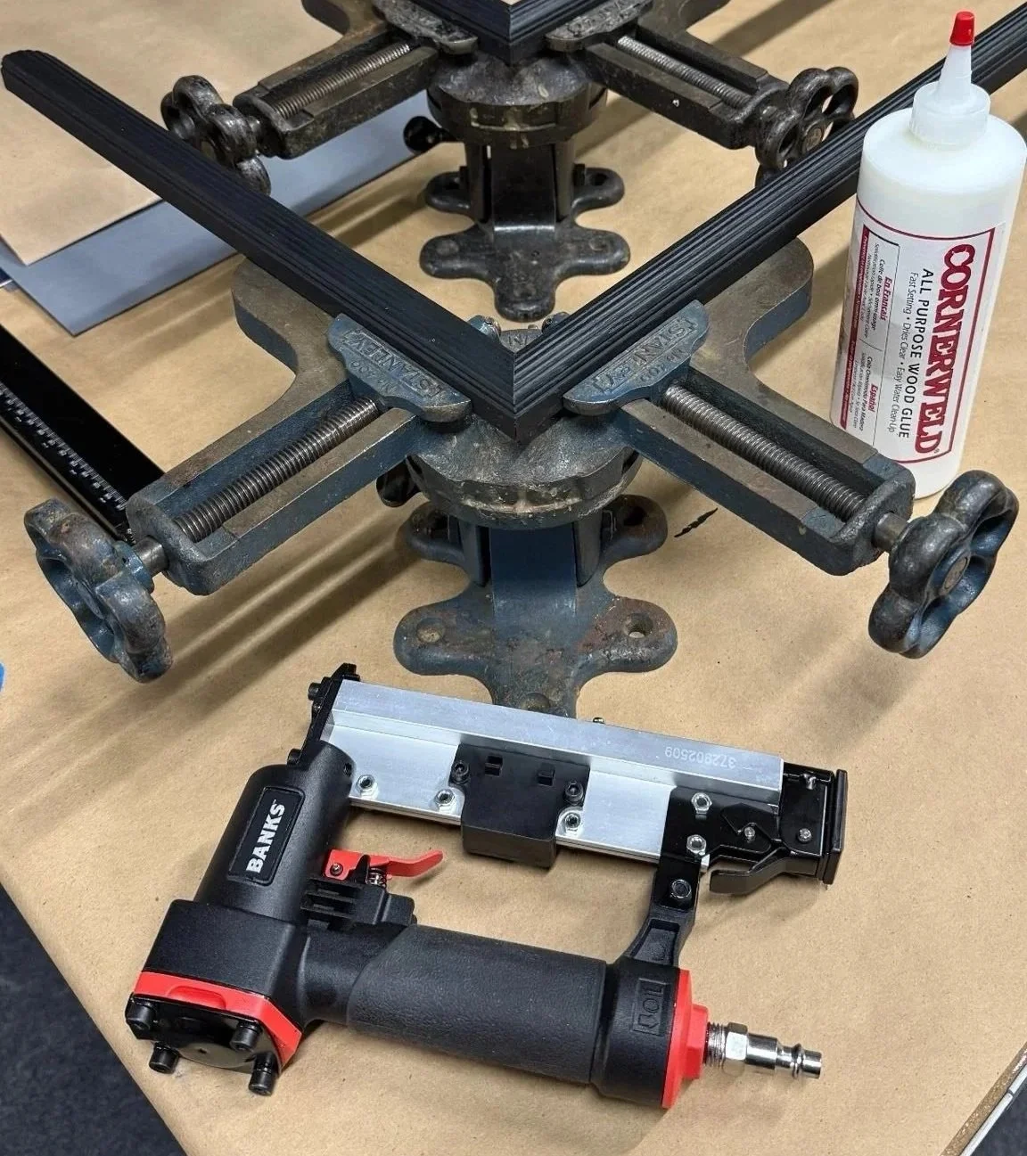 Gluing up a frame with a pin nailer and Cornerweld, in the firm grip of a pair of vintage Stanley No. 400 Miter Vises